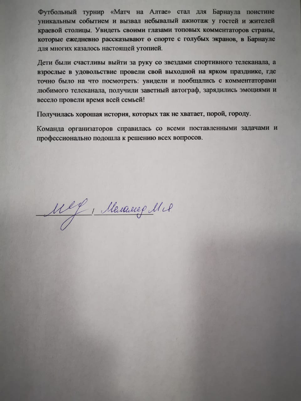 - по тегу #матчнаалтае в Инстаграме сделано более 100 публикаций. Положительные отзывы и слова благодарности самим комментаторам. Негативные отзывы отсутствовали.