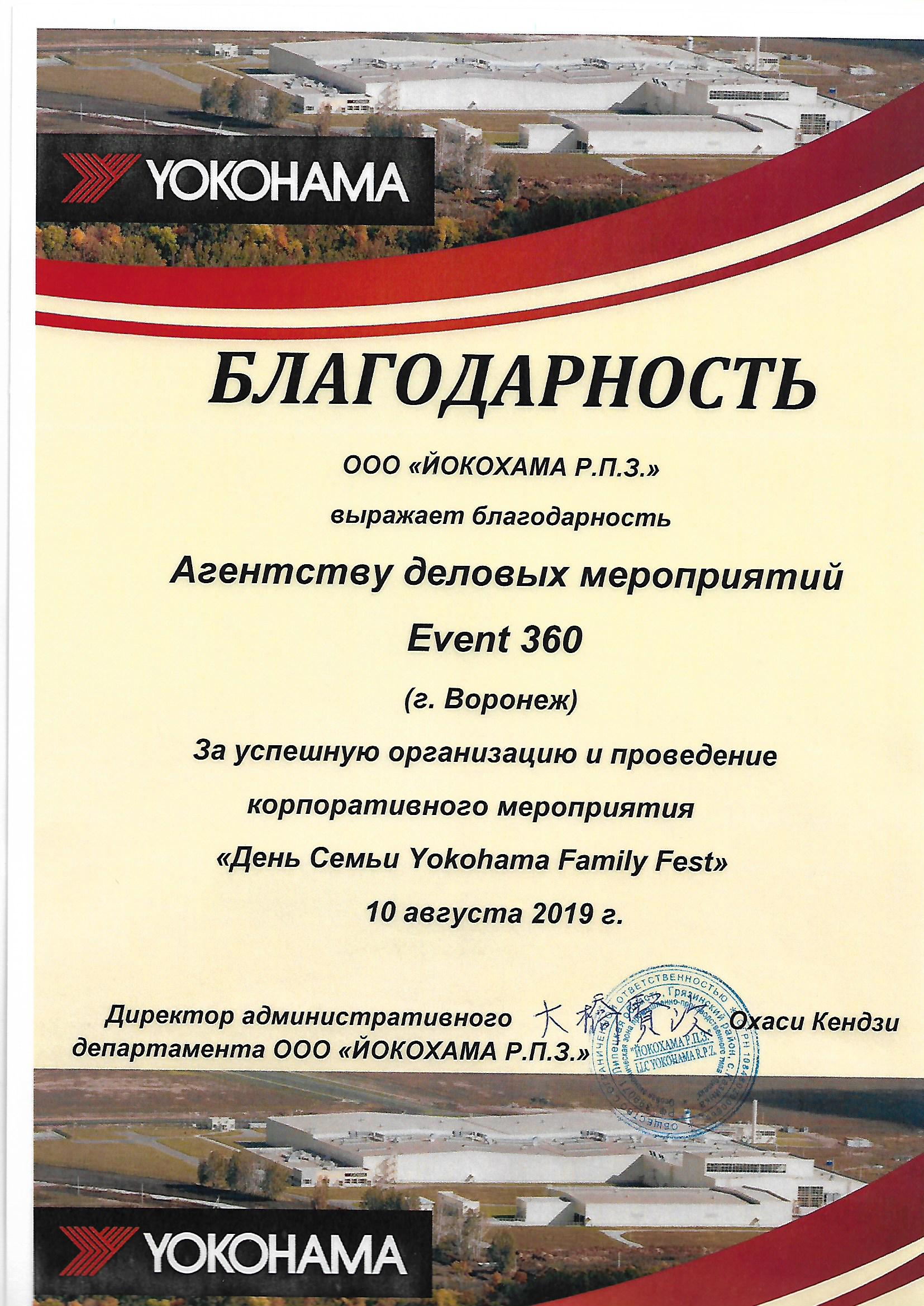 Команде Event360 удалось организовать активное, массовое, интересное событие для сотрудников предприятия, членов их семей и друзей при очень маленьком выделенном бюджете. Мероприятие достигло основной поставленной цели: лояльность родителей, жен и детей сотрудников завода повысилась в разы. По отзывам руководства завода решена так же важная задача по усилению приверженности сотрудников предприятия к корпоративной культуре компании "ЙОКОХАМА Р.П.З".
