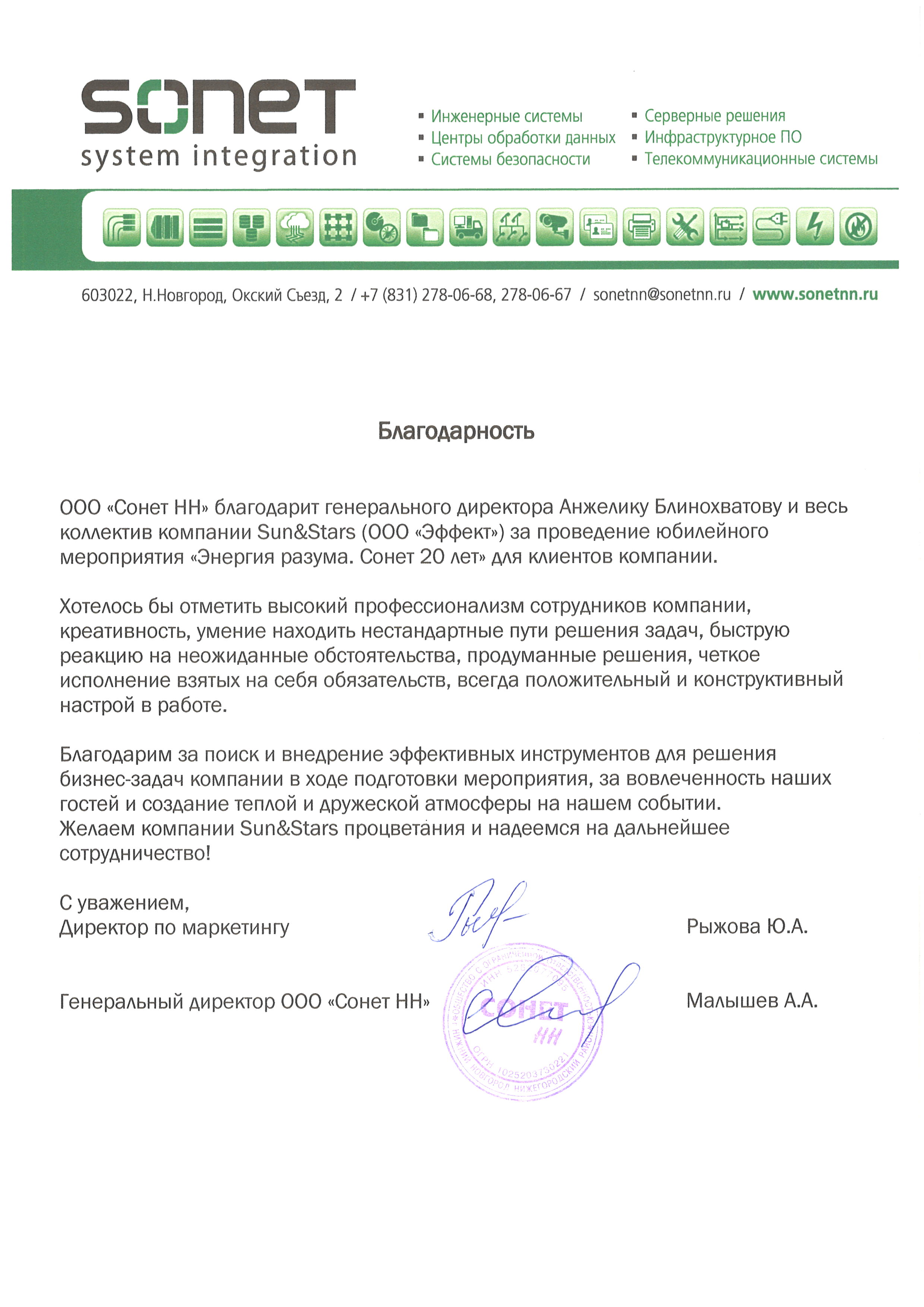 отвечающие основным бизнес-принципам компании «СОНЕТ» .