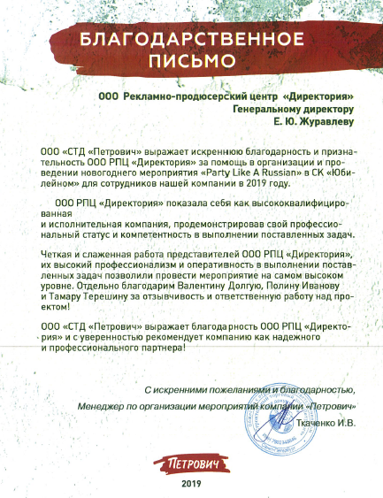 1. Организовать ежегодное корпоративное мероприятие для сотрудников СТД «Петрович», приуроченное к празднованию Нового Года, целью которого является выход на новый более высокий уровень коммуникаций между сотрудниками, за счет увеличение количества участников, смены формата, а также демонстрация высокой степени лояльности компании к своим сотрудникам.