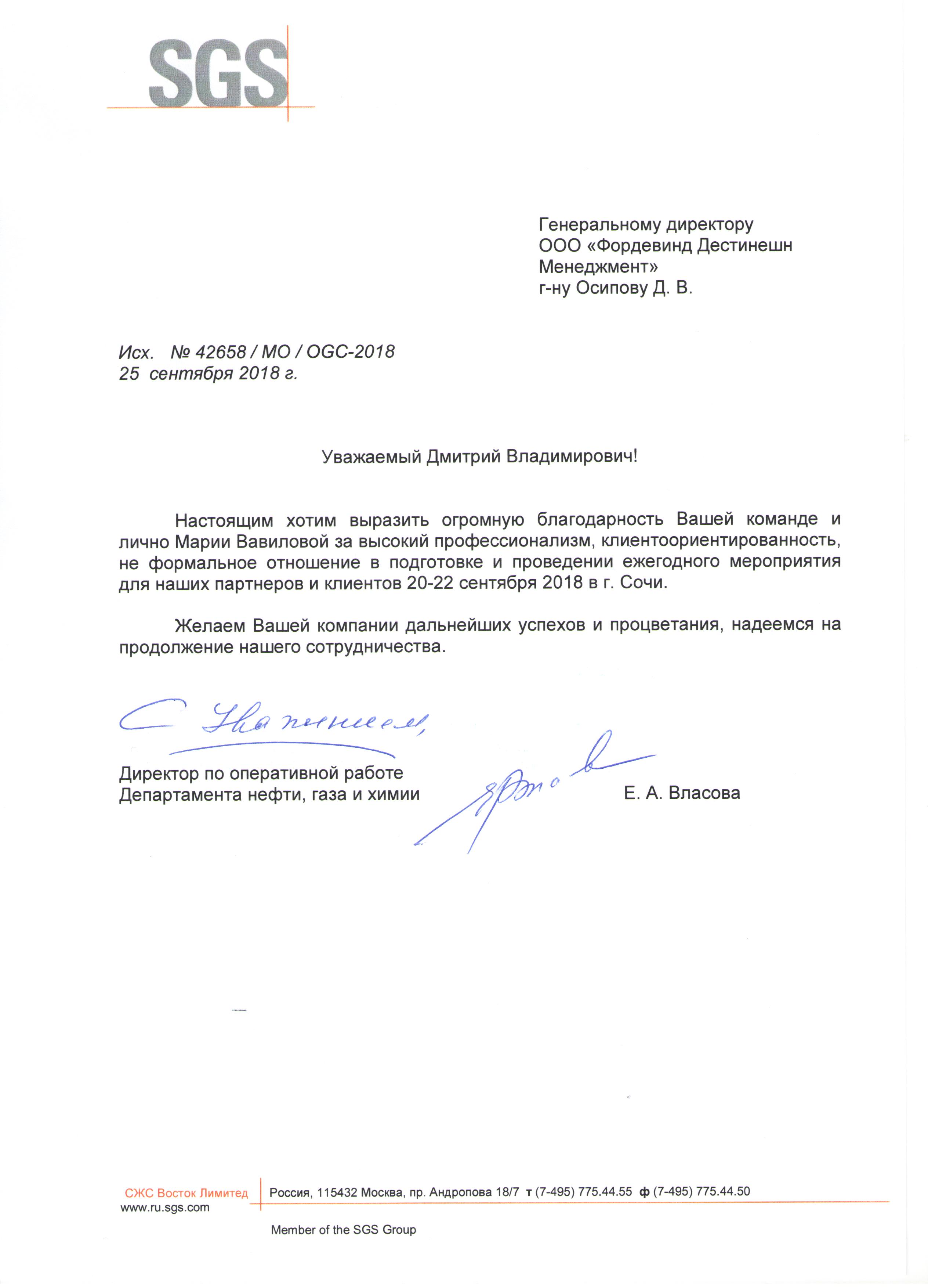 «Настоящим хотим выразить огромную благодарность Вашей команде и лично Марии Вавиловой за высокий профессионализм, клиентоориентированность, не формальное отношение в подготовке и проведении ежегодного мероприятия для наших партнеров и клиентов 20–22 сентября 2018 года в Сочи.